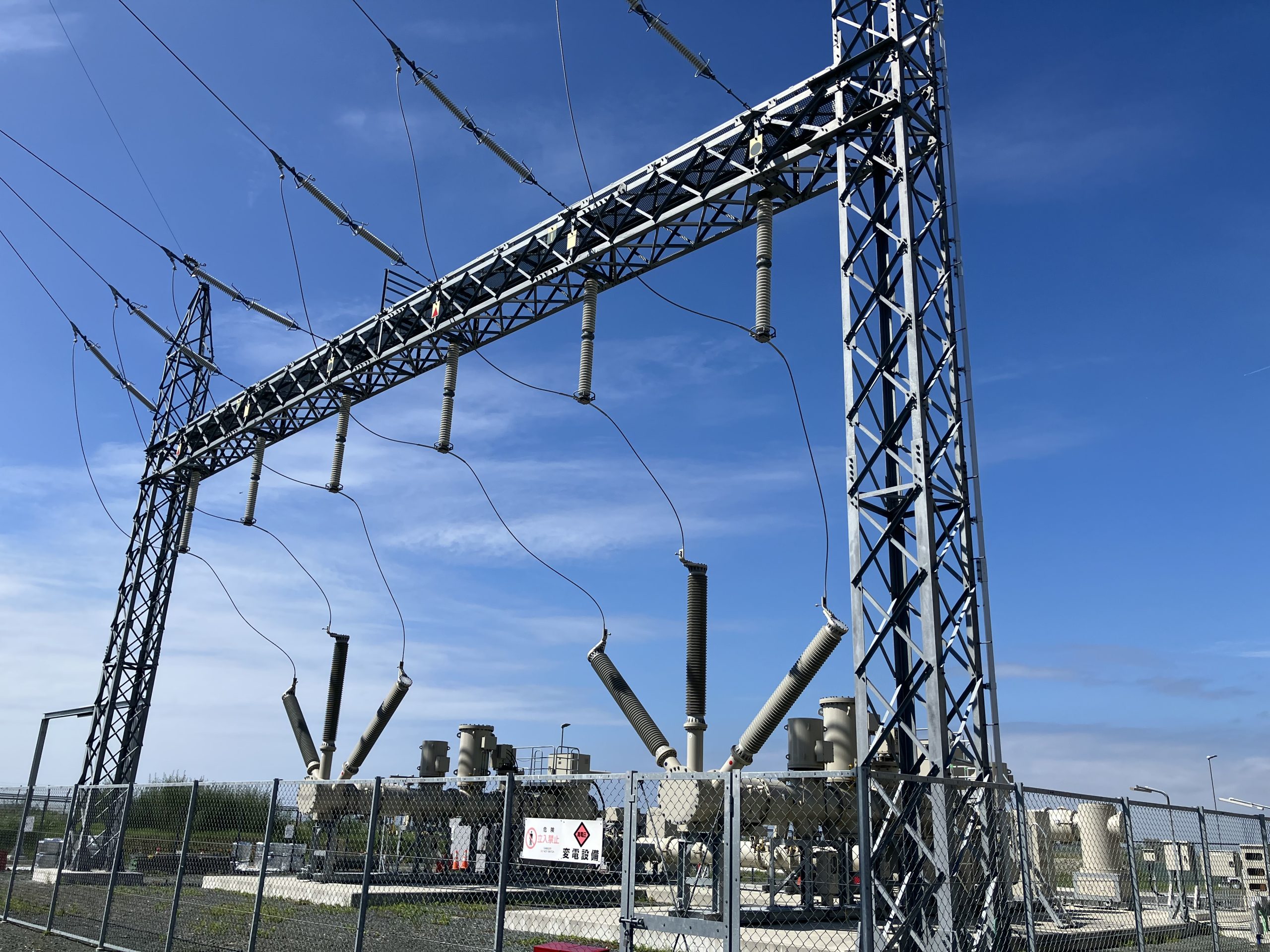 作った電気は、変圧器で電圧を調整し、電力会社の送電線から送り出します。